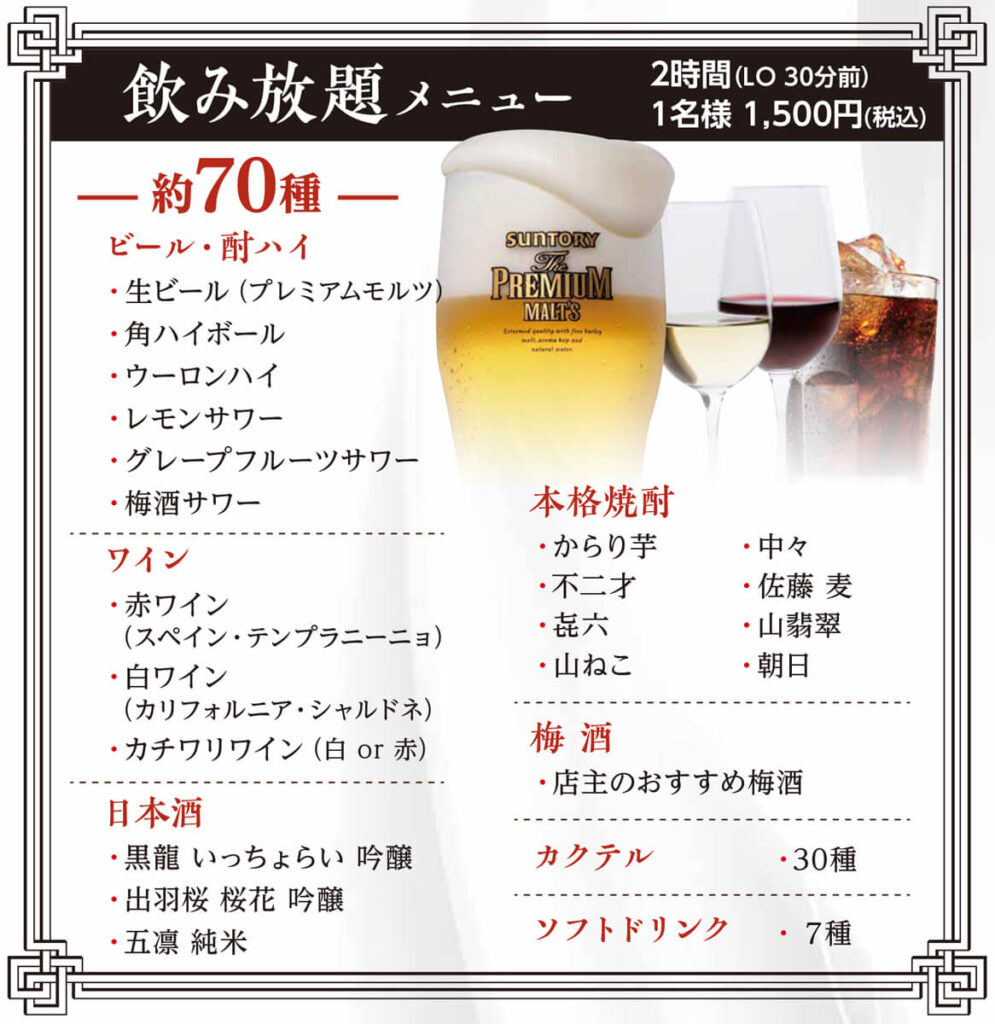 - 飲み放題は、コース以外のアラカルトでご利用の際には、2500円(税込)にて承ります。