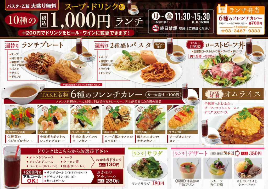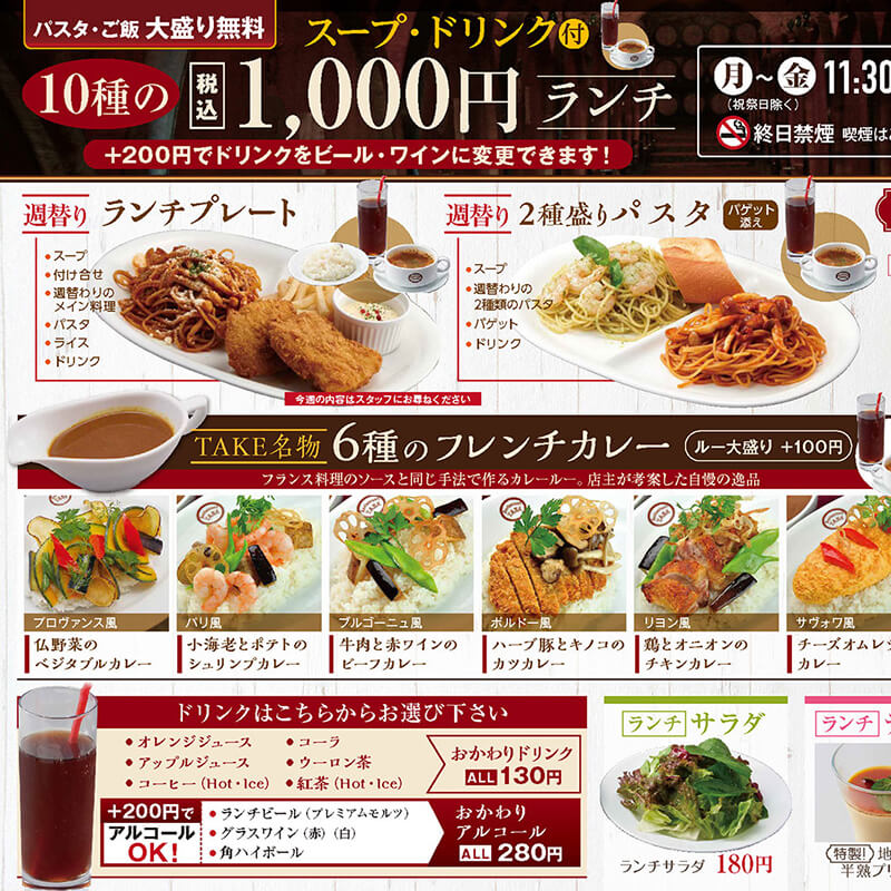 休日はゆったりとランチいかがですか!週替りでメインが選べるコスパ抜群のビストロランチプレートや2種盛りパスタ、特製ライスボウルをご用意!もちろん名物フレンチカレー6種もあります。